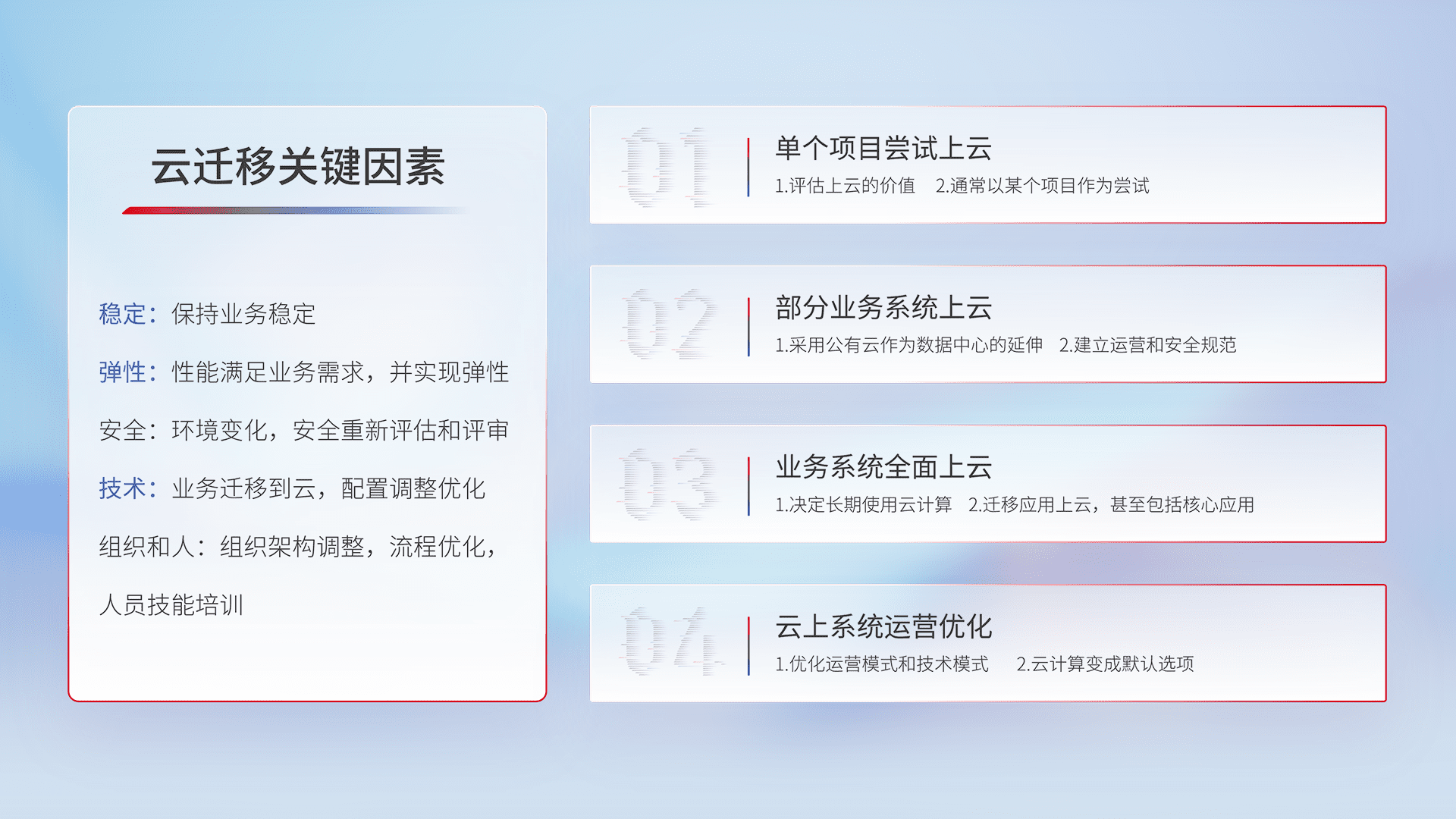 结合实际业务,,从规划设计、、云平台选型、、云原生改造、、数据迁移、、、、集成交付,,,,迁移全过程为客户识别最佳上云路径,,做好风险识别管理,,,,设计网络架构、、、、身份权限、、安全审计合规、、操作审计、、、、日志审计、、监控告警策略、、多站点容灾设计等,,,对云上基础设施进行整体规划,,,提升IT治理水平,,,,以满足弹性、、、高可用、、高性能的需求。。。。